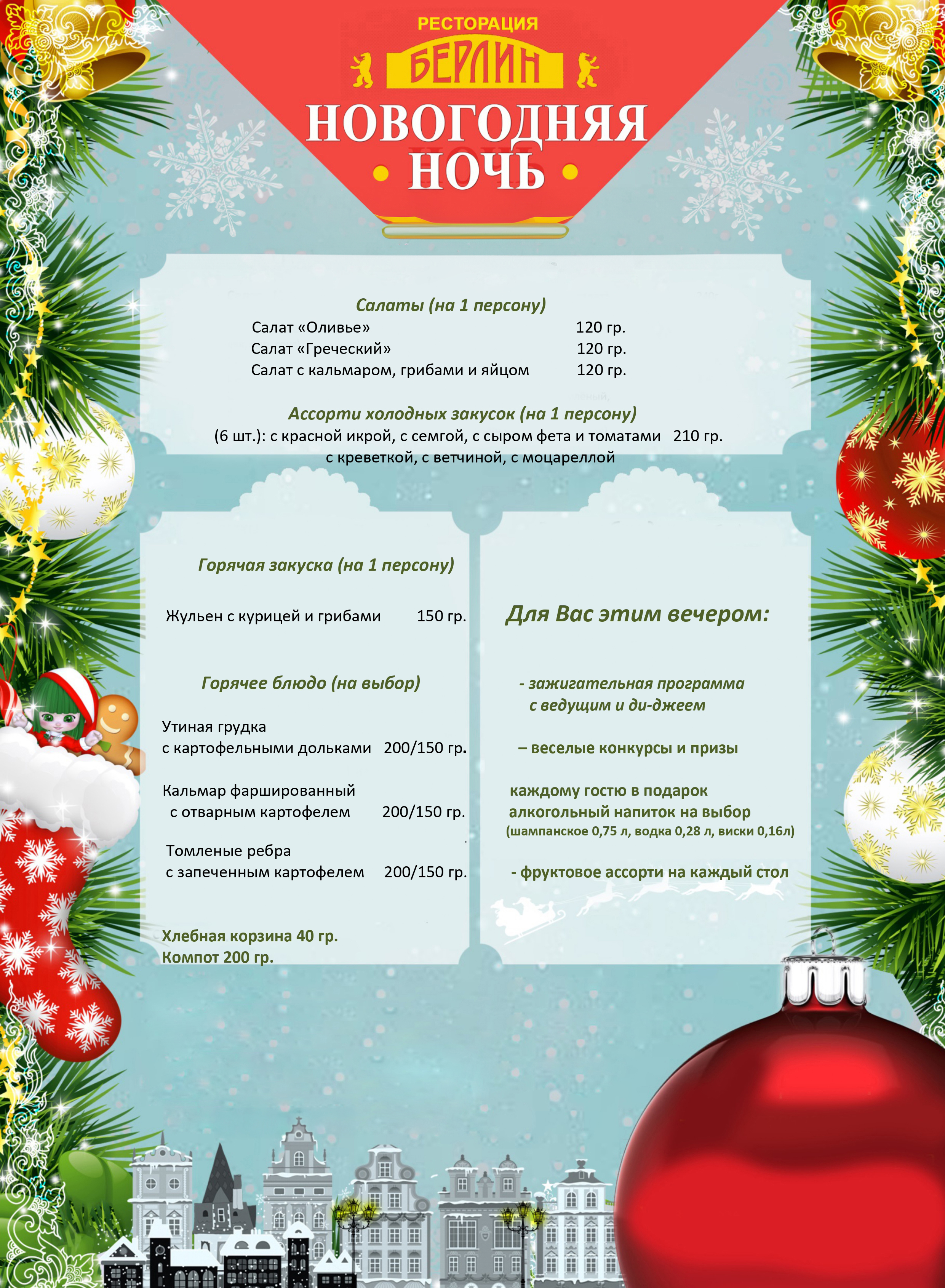 Вечером - Новогодний банкет в "Ресторации Берлин" (по желанию и за доп. плату)** Для вас этим вечером зажигательная программа с ведущим и ди-джеем, веселые конкурсы и призы и, конечно же, праздничный банкет. С меню и программой банкета можно ознакомиться здесь.